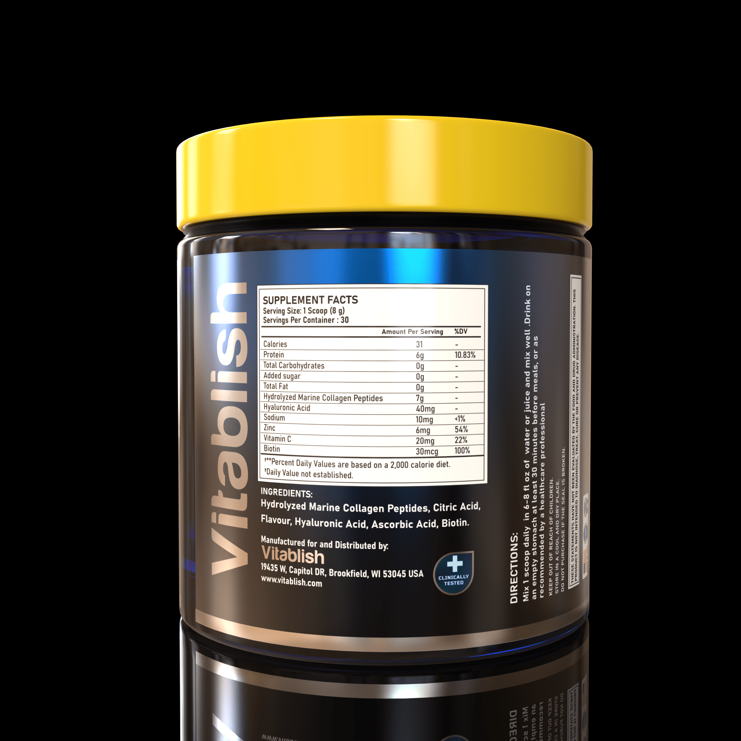 Crafted for those who demand quality, this refreshing orange-flavored powder is easily integrated into your daily routine. Along with marine collagen, it includes Vitamin C and Zinc to further support your body’s natural processes. With 30 servings per container, Vitablish offers a clean and effective way to maintain a youthful appearance and active lifestyle. Simply mix one scoop with water or juice to experience the benefits of premium marine-sourced nutrition.