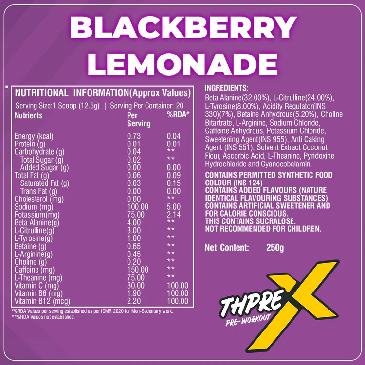 - Beta Alanine (32.00%). L-citrulline(24.005) L-Tyrosine(8.00%). Acidhty Regulatorias 330) (7%), Betaine Anhydrous (5.20%), Chaine Bitartrate, L-Arginine, Sodium Chionde, Caffeine Anhydrous, Patassium Chiondo, Swestening Agent(INS 965), Anti Galing Agent (INS 551), Solvent Edract Coconut Flour, Ascorbic Acid, L-Theanine, Pyrdoxins Hydrochloride and Cyanocobalamin.