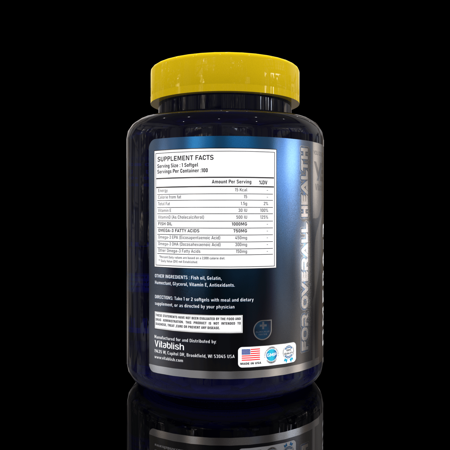 Vitablish Omega-3 is a scientifically formulated dietary supplement designed for individuals seeking comprehensive wellness support. Each serving contains 1000 mg of fish oil, delivering a potent combination of 450 mg EPA and 300 mg DHA. These essential fatty acids are well-known for their roles in supporting cardiovascular health, cognitive function, and joint mobility.